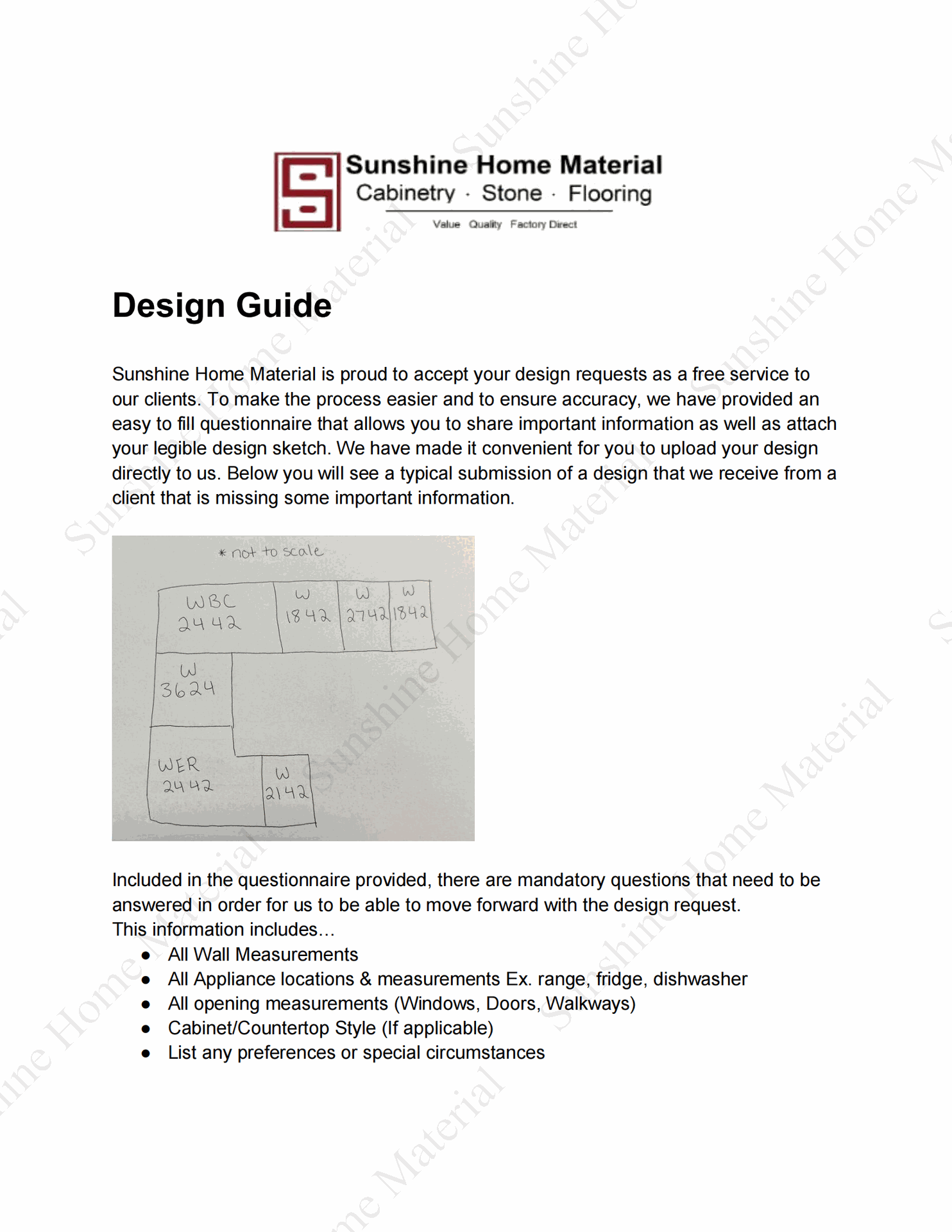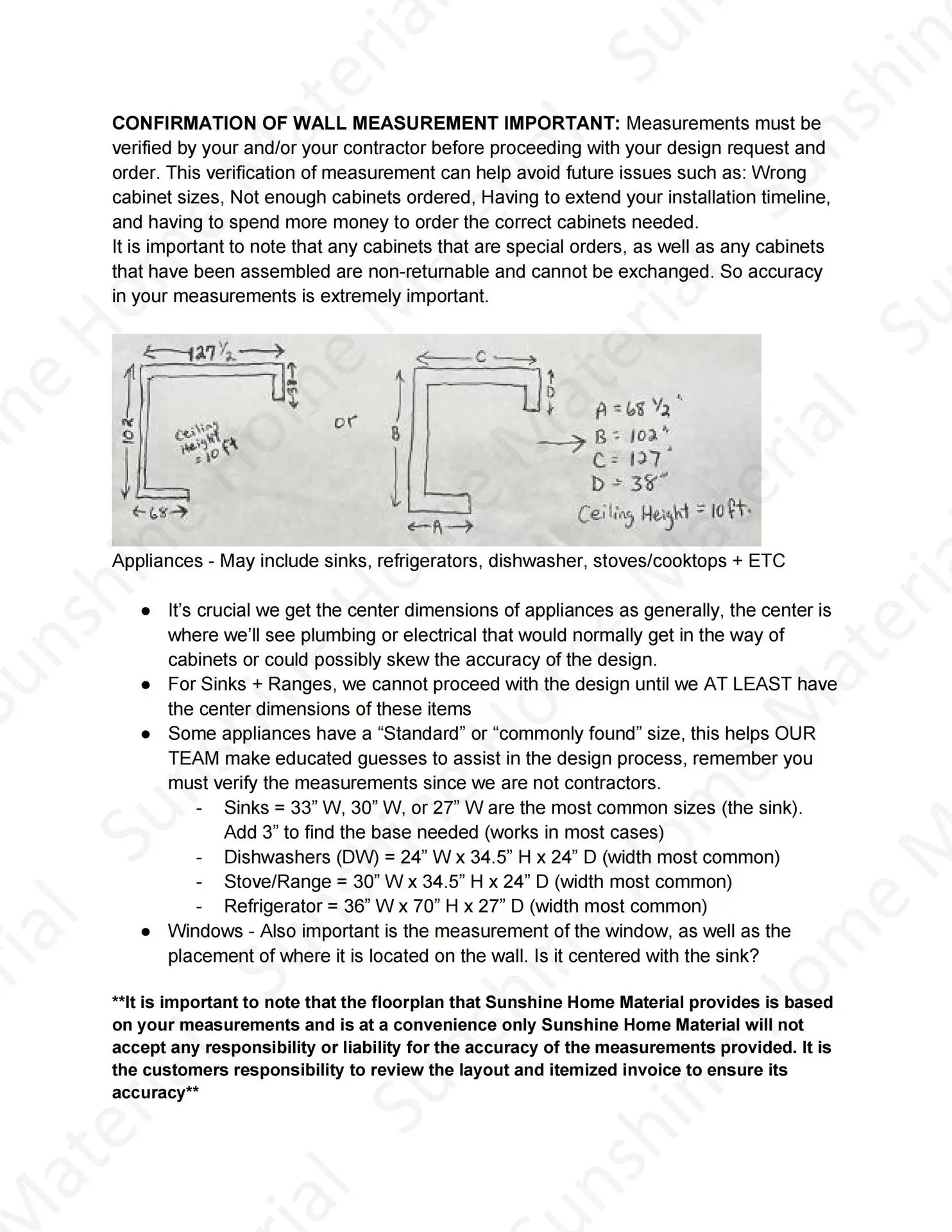 This box is to specify all appliances or desired styles that will be included in your project. This drawing should include but is not limited to the placement of any ovens, dishwashers, bar fridges, microwaves, other appliances, windows, or other obstacles. Having trouble uploading? Send your sketch and/or photos via Text:407-704-8117 or via Email: sales@sunshinehomematerial.com and our team will gladly help you out!